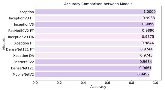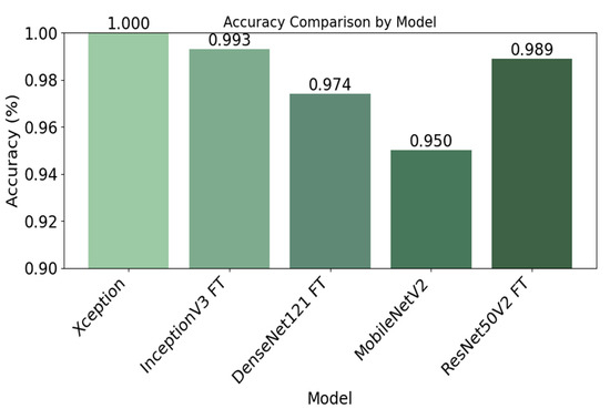 The ResNet50V2 and DenseNet121 models also achieved high levels of accuracy in both configurations (FT and no data augmentation), while fine-tuning provided a small additional improvement. In contrast, MobileNetV2 showed lower accuracy, peaking at 0.9497. This result suggests that although MobileNetV2 is suitable for applications with computational processing constraints, it has limitations compared with more robust models such as Xception or InceptionV3 in terms of ultimate accuracy.