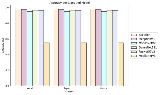 Figure 5 shows that the Xception, InceptionV3 FT, and ResNet50V2 architectures achieved the highest levels of accuracy, standing out as the most effective options for image classification tasks in this context. Based on the accuracy values, none of the CNN models proposed for the automatic waste classification system managed to improve accuracy when data augmentation was applied; so, for this type of system, it is not considered necessary to use the data augmentation technique.