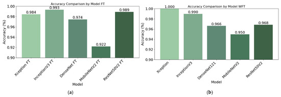 Figure 8b), compared with 0.990 without fine-tuning. Similarly, DenseNet121 and ResNet50V2 improved their performance with fine-tuning, reaching accuracies of 0.974 and 0.989, respectively, compared with their baseline values.