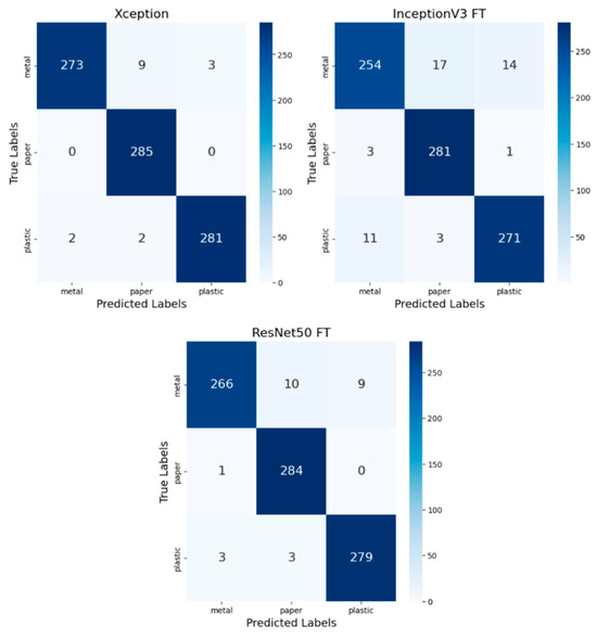 ResNet50 FT delivered an acceptable performance, with 19 errors in the “metal” class (10 misclassified as paper and 9 as plastic), 1 error in the “paper” class (misclassified as metal), and 6 in the “plastic” class (3 as metal and 3 as paper). Although ResNet50 FT demonstrated solid accuracy, it fell short of the performance achieved by Xception.