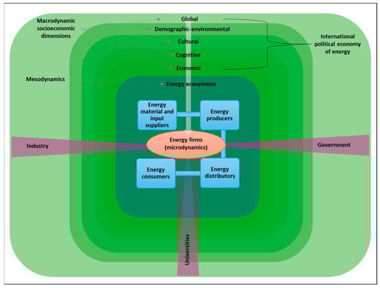 All the above considerations should be placed within a comprehensive multilevel framework, in which macrolevel dynamics (the international political economy of energy, incorporating global, demographic–environmental, cultural, cognitive, and economic factors) intersect with mesolevel processes (EEs that connect suppliers, producers, distributors, and consumers) and microlevel agents (individual energy firms). These interactions also depend on robust university–industry–government linkages, which help align policy initiatives and catalyze innovation in the energy sector [95].