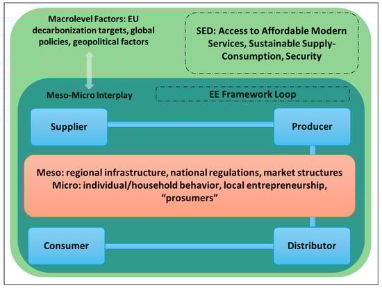 In summary, SED’s broad objectives and the EE framework’s focus on interdependent actors converge by highlighting how each segment of the energy chain—supply, production, distribution, and consumption—can either facilitate or hinder a sustainable transition. Adopting a macro–meso–micro perspective allows a deeper understanding of where emergent technologies, policy shifts, and social acceptance either reinforce or offset each other [3,14].