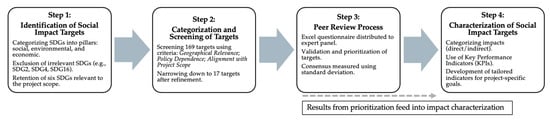 To provide a clear overview of the methodological framework used in this study, Figure 2 visually summarizes the key steps in the social impact assessment process. Each step, from the identification of relevant SDG targets to the final characterization of social impacts, is detailed in the sections that follow.