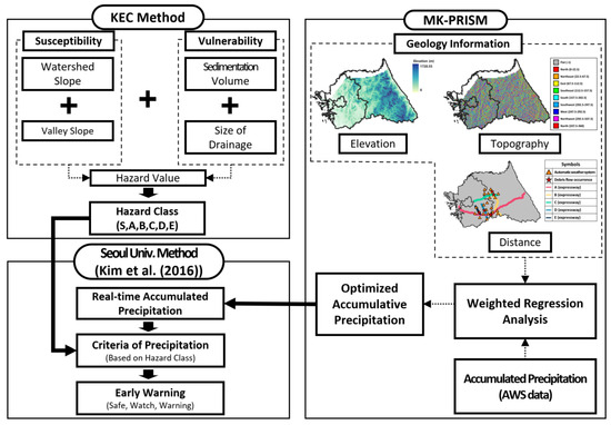 Previous studies, such as KEC [27], quantitatively assessed debris flow hazard along expressway segments and [24] developed an early warning system based on cumulative rainfall using the KEC method. However, the conventional approach did not incorporate geological or topographical factors, relying solely on rainfall data from the nearest AWS or ASOS stations. This limitation is particularly critical in South Korea, where 64% of the terrain is mountainous, and rainfall patterns exhibit significant local variability. Consequently, the system may generate inaccurate warnings for locations where debris flows are unlikely to occur.
