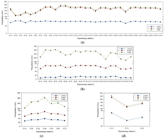 Accumulative precipitation: (a) A expressway, (b) B expressway, (c) C expressway, and (d) D, E expressway.