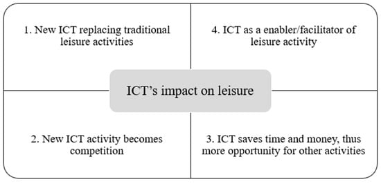 The impact of ICT on leisure activities can be categorized into four types, each expanding an individual’s range of choices, which can be acted upon in different ways [2]. First, ICT can replace traditional leisure activities, offering alternative forms of leisure that may be more engaging or convenient. One example of this impact is the obsolescence of video rental businesses such as Blockbuster. Second, ICT introduces new forms of activities. Increased time spent on ICT-based activities such as mobile gaming naturally reduces time spent on traditional leisure activities such as playing on a playground or participating in a sport. Third, ICT saves both time and money, creating opportunities for additional resources for leisure activities by reducing the time or money previously required for (non-ICT-based) leisure activities. Finally, ICT acts as an enabler or facilitator of leisure activities, making it easier to plan and schedule leisure activities, ultimately encouraging greater participation [2,50,53]. This study used Mokhtarian et al. [2]’s conceptualization of the impact of ICT use on leisure activity to empirically examine and theoretically model ICT’s replacement and facilitation roles (Figure 1).