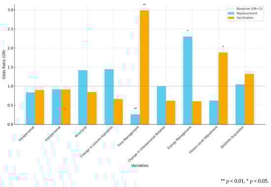 Logistic regression analyses examined the associations of leisure constraints and negotiation factors with ICT use types (replacement and facilitation). Among the leisure constraints, no significant associations were observed for intrapersonal, interpersonal, or structural constraints in either ICT use type. This suggests that an individual’s perception of barriers to leisure activity does not determine how they use ICT for leisure. However, leisure negotiation factors showed notable associations with ICT use types. Time management was significantly associated with both ICT as a replacement and as a facilitator. Participants with higher time management skills were almost three times more likely to use ICT as a facilitator for their leisure activities (OR = 2.985, p < 0.01), indicating they leverage ICT to organize and optimize time for active leisure rather than substituting ICT use for physical activities. On the other hand, participants with higher time management skills were about 74% less likely to use ICT as a replacement (OR = 0.261, p < 0.01).