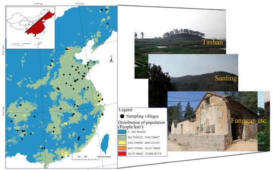 Since the 1990s, the rural area in the southeast, under the Hu Huanyong Line, has been experiencing significant conflicts between food provision and regulation services due to trade-offs between arable land and natural ecosystems. To evaluate ecosystem services at the village scale in densely populated rural China, a field investigation and data collection were conducted in 96 selected traditional villages (Supplementary Materials, Table S1). Villages located in densely populated areas were sampled according to their topography and proximity to central cities. In addition, considering the influence of urbanization and distance from the central city on rural ecosystems, the sampled villages spanned between 20 and 120 km from the central city. Thus, the sampled villages are representative of the present conditions of densely populated areas in China, namely rural areas to the southeast of the Hu Huanyong Line and the surrounding area (Figure 1).