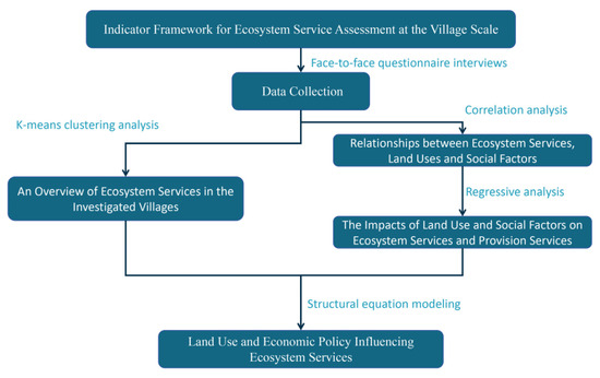 An integrated step-by-step methodology, from data collection to data analysis. Face-to-face interview questionnaires were conducted to collect data. K-means clustering analysis was used to further understand the characteristics of the ecosystem service component of different villages. Correlation and regression analyses were conducted to identify the impacts of the factors on ecosystem services. In order to determine the impact of the above factors on ecosystem services, a structural equation model was used to demonstrate how land use and economic policies affect ecosystem services.