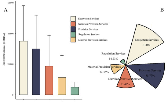 Bar chart showing the average value of ecosystem services per hectare per year (A) and the proportion of ecosystem services (B) in the 96 investigated villages. The bar chart demonstrates that provision service value and, in particular, the nutrition provision service value exhibit a significant precedence over the regulation service value. Error bars are shown with standard deviations.