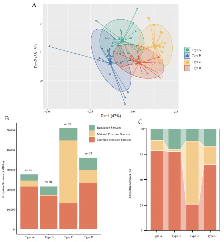 Village classification was performed through K-means clustering divided into four categories (A). The bar chart shows an average of the total ecosystem service values per hectare per year and the components of ecosystem service values for each category of the investigated villages (B,C). The numbers on the top of each bar indicate the numbers of the village belonging to the corresponding category. The bars are ordered according to the average of total ecosystem service values per hectare per year. Except for villages of type C, the provision (nutrition) service value is dominant in the three other village types. Provision value occupies the main position in all villages.