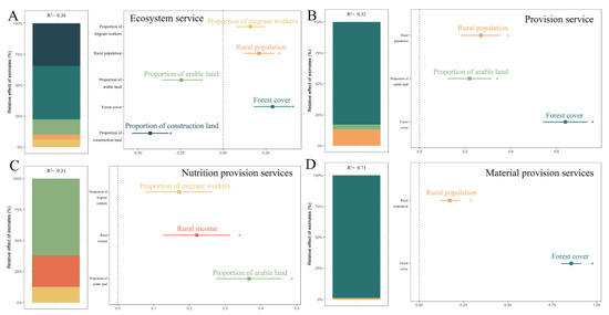 Provision services, as the main rural ecosystem services, are mainly influenced by forest cover, the proportion of arable land, and rural population (adjusted R2 = 0.32) (Figure 6B). The proportion of arable land, rural income, and the proportion of migrant workers are the key factors that influence nutrition provision services (adjusted R2 = 0.31). The proportion of arable land is the greatest influencing factor (Figure 6C). Material provision services are mainly influenced by forest cover and rural population (adjusted R2 = 0.71) (Figure 6D). Forest cover has the greatest impact on provision services and material provision services (Figure 6B,D). These factors are significant at the 1% level, and their collinearity tolerance meets the specified requirements. A collinearity test was also conducted, resulting in a VIF of less than 5. Both land use types and social factors influence the rural ecosystem service values.