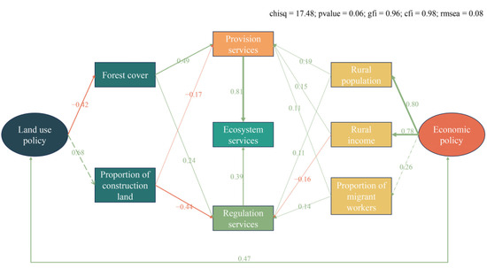 Land use policies and economic policies affect rural ecosystem services based on SEM results. Land use policies and economic policies affect rural ecosystem services by changing land use types, population mobility, and rural income.