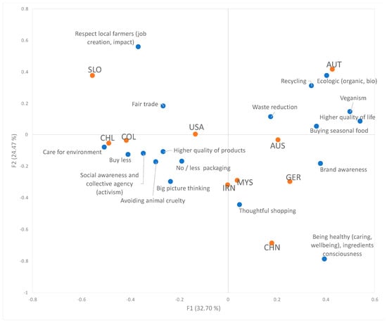 The relationship between representations and countries is defined by the distance of the label lines from the origin of the diagram and by the angle between these lines. Long lines and small angles between them indicate a stronger relative connection. Slovenia, Austria, and China are the most distant compared to the other countries and are therefore most characterized by certain representations. Slovenia emphasizes respect for local farmers as a defining feature of sustainable consumption. Austria highlights practices like recycling, buying organic products, and veganism. China links sustainable consumption with health and thoughtful shopping, also resonating with Malaysia and Iran, albeit to a lesser extent. Australia associates sustainable consumption with seasonal food purchases and higher quality of life. Chile and Colombia focus on environmental protection, buying less, and social awareness. Germany connects sustainable consumption to health and brand awareness, with thoughtful shopping aligning it more closely with Asian countries. The USA, positioned near the origin of the graph, appears neutral, with no dominant representation standing out compared to other countries.