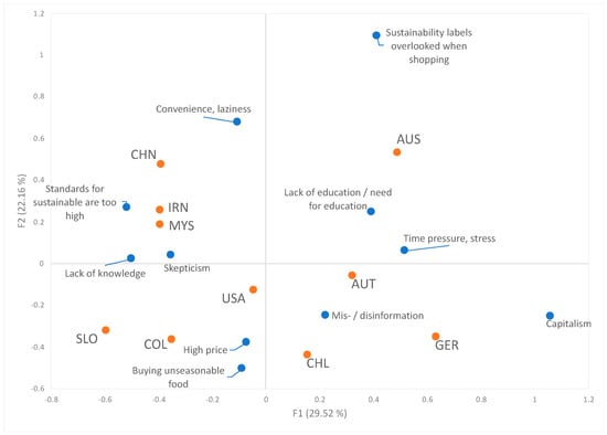 Correspondence analysis—cross-country differences in terms of barriers to sustainable consumption.