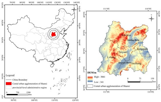 The central Shanxi urban agglomeration stands in the center of Shanxi (39°39′ N–36°38′ N, 114°9′ E–110°23′ E) and represents an important economic and population hub in northern China. It primarily includes the cities of Jinzhong, Taiyuan, Lüliang, Xinzhou, and Yangquan. It covers an area of 74,100 km2, accounting for 47.3% of the province’s total area (Figure 1). The natural environment is characterized by a temperate continental monsoon climate, featuring four distinct seasons with precipitation concentrated in the summer. Geographically, the region is defined by the Taihang Mountains to the east and the Lüliang Mountains to the west, with the Fenhe Valley situated in between. These unique geographical conditions significantly contribute to the ecological security of the area and support diverse ecosystems. The central Shanxi urban agglomeration possesses abundant plant and animal resources, with forests, wetlands, and grasslands representing the primary types of ecosystems. The wetlands of the Fenhe River basin play a critical role in water conservation, flood regulation, and the maintenance of biodiversity. The region is also home to several rare species, such as the North China leopard, highlighting the importance of ecological conservation [39]. As of the end of 2021, the permanent population in the area reaches 16.13 million, and the local gross domestic product (GDP) amounts to 1.13 trillion yuan, accounting for 46.3% and 50% of the province’s total, respectively. This indicates its significant role in the economic development of Shanxi province and the nation as a whole. Furthermore, the central Shanxi urban agglomeration encompasses numerous development platforms, including 17 national key development zones and 36 provincial development zones, with four designated as national-level development zones. While coal mining, metallurgy, and the chemical industry drive the development of the central Shanxi urban agglomeration, they also contribute to environmental pollution issues [40]. In recent years, with the promotion of the concept of green development, Shanxi province has implemented several ecological restoration initiatives, such as converting farmland back to forest and grassland. These measures result in increased vegetation coverage and significant changes in land use.