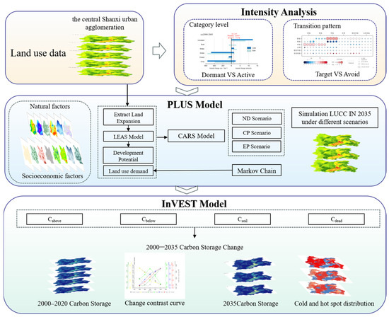 This study is structured into 3 main parts: (1) Intensity analysis methods are employed to analyze LUCC data from 2000 to 2020, focusing on category-level transformation patterns; (2) The PLUS model simulates and predicts land use projections for 2035 using LUCC data and various driving factors, including natural and economic influences; (3) Finally, the relation between present LUCC and carbon storage in the central Shanxi urban agglomeration is revealed by using the InVEST model to assess how LUCC has affected the ecosystem’s ability to store carbon (Figure 2).