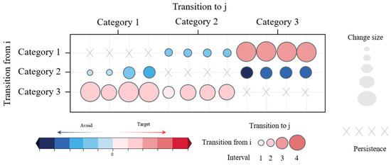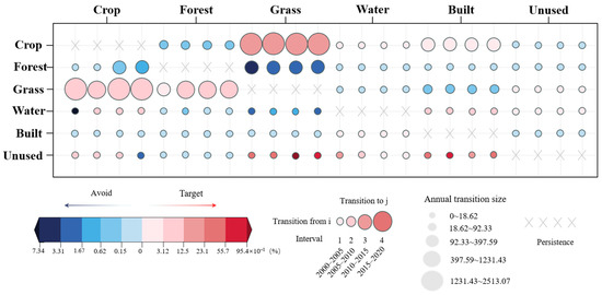 The amplitude, intensity, and stability of different transitions cannot be fully and intuitively represented by the original intensity analysis [23]. To describe LUCC, this study makes use of transition diagrams [26]. The patterns of transition between various land types are depicted in Figure 3. The transition is categorized as stable and favorable when the intensity of change from land category I to land type J surpasses the uniform intensity over all time intervals; otherwise, it is categorized as stable and avoided. The land types at the first and last time points are shown in Figure 3 as rows and columns, respectively. The bubbles’ colors show whether the conversion intensity is either greater or less than the consistent intensity, indicating the tendency or avoidance of conversion, while their size reflects the magnitude of the transitions. The stability of the transition process during the full duration is evaluated by laterally comparing the bubble colors.