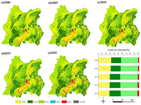 Figure 4 illustrates the spatial–temporal distribution and land use framework in the research region between 2000 and 2020. Cropland is mainly found in flat plains and basins, such as the Xinding and Taiyuan Basins, in terms of spatial distribution. These regions benefit from favorable climatic conditions, water resources, and agricultural infrastructure, establishing them as significant food production bases. In contrast, forest land is predominantly found in the highlands and steep regions, such as the Lüliang Mountains and the Taihang Mountains. These areas are unsuitable for cultivation but favorable for afforestation, which aids in water and soil conservation and prevents soil erosion. Grassland is mainly concentrated in semiarid regions or mountainous areas, such as the Xinding Basin, where precipitation is relatively low. Water bodies are dispersed but are primarily located in low-lying areas between urban centers traversed by rivers, such as the Fen River and the Hutuo River. Densely populated areas surrounding the Taiyuan Basin and the Xinding Basin are the primary regions for built-up land.