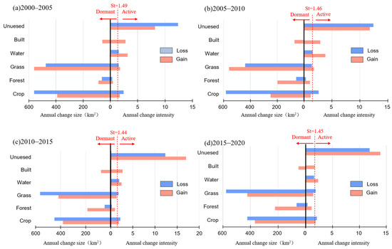 Figure 5 illustrates the changes in various land types over four time intervals. The red dashed line represents the average annual change intensity for each interval. If the change intensity of a category exceeds the average annual change intensity, this indicates that the annual change for that category is active; conversely, a lower change intensity suggests a dormant status for that land type.