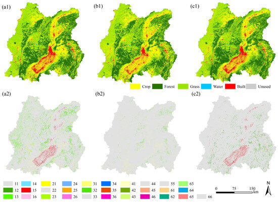 Different scenarios for central Shanxi urban agglomeration in 2035 LUCC. Notes: (a1–c1) are the spatial distribution maps of land use under the natural development scenario, cropland protection scenario, and ecological protection scenario in 2035, respectively; (a2–c2) are spatial distribution maps of land use change from 2020 to 2035 under three scenarios. Among them, 1 represents cropland, 2 represents forest land, 3 represents grassland, 4 represents water area, 5 represents built-up land, and 6 represents unused land. In the legend, 11, 22, 33, 44, 55, and 66 represent the unchanged areas from 2020 to 2035; 12 represents the area where cropland is converted to forest land; 13 represents the area where cropland is converted to grassland; 14 represents the area where cropland is converted to water area; and so on.