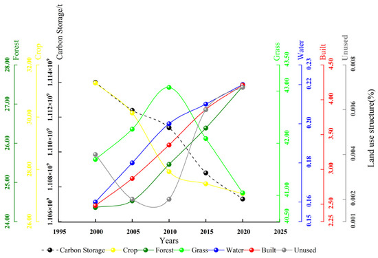 Variation curve of carbon stock and trend curve of area share of each LUCC. Notes: The carbon storage curve in the figure illustrates the changes in total carbon storage in the study area over time. The curves for each land type represent the proportion of each land type within the study area for each year. Given the varying carbon storage capacities of different land types, changes in carbon storage can be inferred by comparing the proportions of these land types.