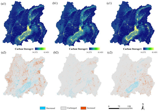 Forecast of carbon stocks and changes in the central Shanxi urban agglomeration in 2035. Notes: (a1) is the spatial distribution map of carbon storage under the natural development scenario in 2035; (a2) is the carbon stock change map from 2020 to 2035 under natural development scenarios; (b1) is the spatial distribution map of carbon storage under the scenario of cropland protection in 2035; (b2) is the carbon stock change map from 2020 to 2035 under the scenario of cropland protection; (c1) is the spatial distribution map of carbon storage under the ecological protection scenario in 2035; (c2) is the carbon stock change chart from 2020 to 2035 under ecological protection scenarios.
