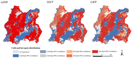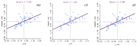 We used Geoda 1.22 software to analyze the spatiotemporal differences in carbon storage in the study area, and the results are shown in Figure 11. The Moran’s I values for the three scenarios are 0.434, 0.463, and 0.464, all of which are positive spatial correlations, indicating that the distribution of regional carbon storage has a significant positive spatial correlation and is clustered in space. Hotspot analysis reveals that in 2035, differences in clustering distributions of high and low carbon stock values are minimal across the ND, CP, and EP scenarios (Figure 12). Notably, carbon storage hotspots predominantly occur in most areas of Lüliang except the southwest, western Taiyuan, western and eastern parts of Xinzhou, and southeastern Jinzhong. The overall hotspots under the CP and EP scenarios are relatively weaker compared to the ND scenario. High levels of vegetation cover and intense ecological land use are characteristics of these areas. For instance, the western parts of Lüliang and Xinzhou are mainly located inside the Lüliang mountains region, both with heavy vegetation covering. Conversely, carbon cold spots are mainly situated in the Xinzhou and Taiyuan Basins, townships, and agricultural ecological zones, areas typically marked by a dense population and frequent human activity.