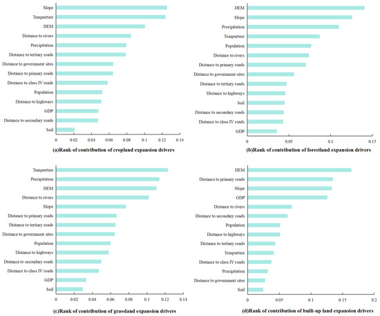 Regarding cropland, it was found that slope has the greatest contribution to cropland growth. In the study area, the primary factors influencing cropland expansion are natural factors, including slope and temperature. Areas with gentler slopes facilitate mechanized operations, and land leveling reduces agricultural costs, thereby promoting large-scale cultivation and farming, which effectively enhances agricultural productivity. Consequently, these areas are more likely to be developed as cropland. Additionally, suitable temperatures favor the growth and development of crops; regions with optimal temperatures can meet the growth requirements of various crops, increasing the likelihood of high yields. This potential for increased productivity attracts individuals to cultivate more land for cropland to obtain greater profits.