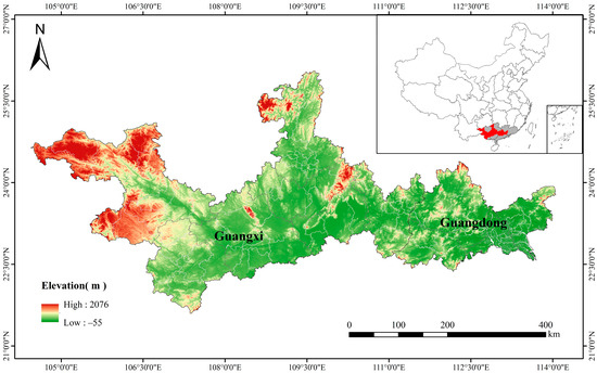 The PRXJEB is located in South China, in the subtropics, with a warm and humid climate. The average annual temperature ranges from 14 to 20 °C, and the annual precipitation is 1500 to 2500 mm [21], with favourable light, heat, and water conditions, which help to support the planting and growth of crops such as rice, sugarcane, and peanuts [22]. The PRXJEB stretches across Guangdong and Guangxi in an east–west direction, with complex and diverse topography. Among them, the topography of the Guangxi section is more undulating, dominated by hills and mountains, while the Guangdong section, on the other hand, is relatively flat, mostly located in the Pearl River Delta region, and it is dominated by plains. The PRXJEB covers a total of 11 prefecture-level cities and 88 counties (districts and cities) in Guangdong and Guangxi, with a resident population of 62.75 million and a GDP of USD 908.94 billion in 2021. The highest value of GDP is found in Tianhe District, Guangzhou City, reaching USD 93.1891 billion, while the lowest value is in Leye County, Baise City, at USD 0.5912 billion. As the Guangdong section is a developed area in the east and the Guangxi section is an underdeveloped area in the west, there is a significant difference in the level of economic development between the east and the west. The development of the economic belt will help to narrow the economic gap between the two regions and achieve mutual benefit and win–win results (Figure 1).