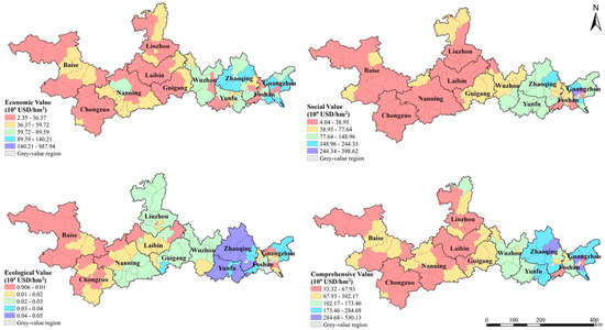 Overall, the zoning of the comprehensive value of CL resources closely mirrors that of economic and social value. The area with the lowest-value area is the Jiangzhou District of Chongzuo City, at 33.32 × 104 USD/hm2, while the highest-value area is found in the Baiyun District of Guangzhou City, at 530.13 × 104 USD/hm2. After designating six districts—Chancheng District, Duanzhou District, Haizhu District, Liwan District, Tianhe District, and Yuexiu District—as grey-value regions, the remaining 82 counties (districts and cities) are categorized into 36 low-value areas, 21 low-middle-value areas, 11 middle-value areas, 11 middle–high-value areas, and three high-value areas. The comprehensive value of CL resources is predominantly composed of medium-value and low-value areas.