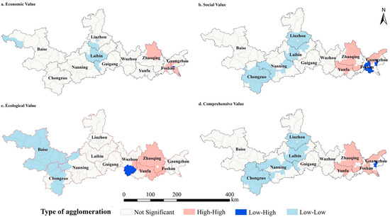 In this study, we utilized “clustering and outlier analysis” in ArcGIS10.7 software to analyse the spatial local autocorrelation of the values of CL resources in 88 counties (districts and cities) within the PRXJEB, and we drew the LISA clustering map of the values of CL resources (Figure 3). As can be seen from Figure 3, (1) regarding the economic value of CL resources in counties of the PRXJEB, the majority of counties (districts and cities) do not exhibit significant spatial clustering. The number of counties and districts showing clustering phenomena is relatively small. The “high-high” agglomeration area is located in Huaiji County, Guangning County, Nanhai District, Baiyun District, Panyu District, and Nansha District in Guangdong Province. The “low-high” agglomeration area is located in Tianhe District in Guangdong Province. The “low-low” agglomeration areas are located in Xilin County, Xingbin District, Wuxuan County, Liujiang District, Liubei District, and Qintang District in Guangxi Province. (2) In terms of the social value of CL resources, the “high-high” agglomeration areas are concentrated at the eastern end of the PRXJEB in Guangdong Province, which mainly include Yunan County, Yunan District, Yuncheng District in Yunfu City, Huaiji, Guangning, Deqing, and Gaoyao Districts in Zhaoqing City, and Huadu and Conghua Districts in Guangzhou City. The “low-high” agglomerations are found in Huangpu District in Guangzhou City and Nanhai and Shunde Districts in Foshan City; the “low-low” agglomeration area is mainly located in Chongzuo City, Nanning City, and the central part of Laibin City, as well as the southern part of Liuzhou City in the Guangxi section of the economic belt. (3) For the ecological value of CL resources, “high-high” agglomeration areas are primarily concentrated in Zhaoqing, Yunfu, and Gaoming Districts of Foshan City in the Guangdong section of the economic belt and Longxu District of Wuzhou City in the Guangxi section of the economic belt; the “low-high” agglomeration area is in Cenxi City in Wuzhou City, Guangxi Province. The “low-low” agglomeration area is larger and mainly concentrated in Baise City, Chongzuo City, and Long’an County and Mashan County in Nanning City, Guangxi Province. The distribution of agglomerations of the comprehensive value of CL resources is almost identical to the distribution of agglomerations of social value.