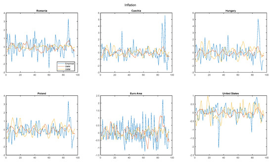 In Figure 1 and Figure 2, the empirical evolutions of the output gap and inflation for each analyzed country are depicted (blue line), alongside the output gap and inflation generated from the re-estimation of New Keynesian models with behavioral expectations (orange line) and rational expectations (yellow line). These estimations utilize the parameters presented in Table 1, obtained through the SMM and GMM. From the graphs of the output gap, it can be observed that the SMM-based behavioral expectations (BH) model (orange) and the GMM-based rational expectations (RE) model (yellow) qualitatively follow the empirical trends, albeit with notable discrepancies in volatility levels. Regarding inflation, the empirical data (blue line) generally shows higher volatility compared to the BH and RE simulations. The BH model provides a better fit for countries with volatile and persistent deviations in the output gap, such as the USA, Romania, and Poland. However, the RE model aligns more closely with smoother dynamics, as seen in the Euro Area. These results highlight the importance of accounting for behavioral factors in macroeconomic modeling, particularly in economies with high volatility and agent heterogeneity.