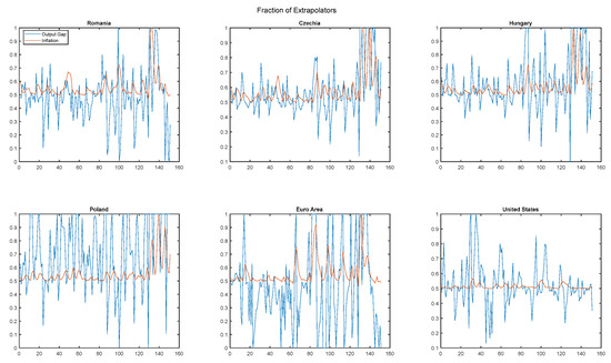 In Figure 3, we see the fractions of extrapolators for the output gap (blue line) and inflation (orange line) across six countries: USA, Euro Area, Czechia, Hungary, Poland, and Romania. These fractions represent the proportion of agents in the behavioral model who base their expectations on past realizations rather than fundamental equilibrium values. It is observed that, for most of the time, the share of extrapolating agents exceeds 50%, sometimes reaching as high as 100%. The fractions of extrapolators for the output gap and inflation vary significantly across countries. For the output gap, the share of extrapolators ranges from 45% in the Euro Area (the lowest proportion) to 71% in Poland (the highest). For inflation, the share of extrapolators varies between 50% in the USA (the lowest) and 58% in Czechia and Hungary (the highest). The results indicate that, on average, the extrapolation rule generally has a relatively superior performance. Furthermore, the variability of these probabilities over time highlights that agents adjust their forecasting rules based on the rule’s performance.