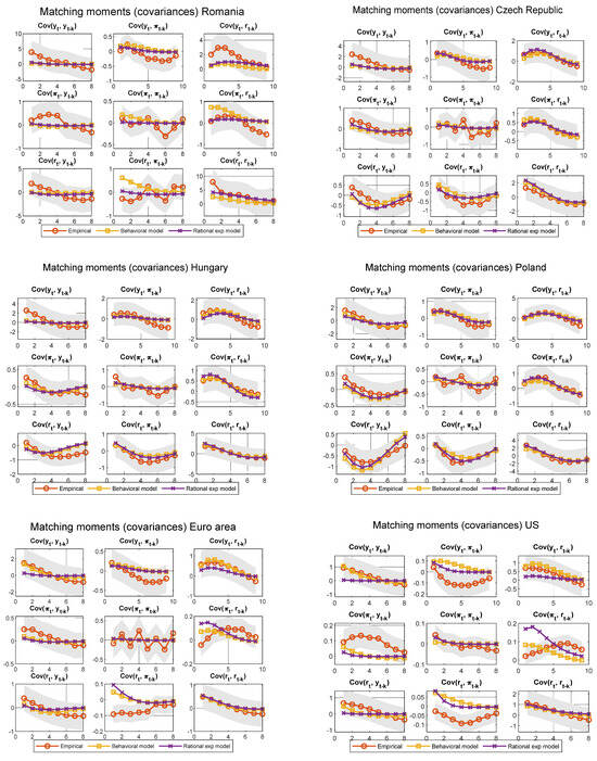 In Figure 4, the empirical and simulated auto- and cross-covariance profiles for the macroeconomic variables (output gap, inflation, and interest rate) are presented across the USA, Euro Area, Czechia, Hungary, Poland, and Romania. The graphs demonstrate that the behavioral heuristics model generally provides a better fit than the rational expectations (RE) model when capturing the persistence and gradual decay of these covariances across most variables. Notably, the Central and Eastern European (CEE) economies (Czechia, Hungary, Poland, and Romania) show a stronger alignment between the empirical data and the BH model, especially at longer lags. This suggests that economic agents in these regions tend to rely more on past information, such as historical inflation or output gap levels, when forming expectations. Such behavior may stem from factors like the limited access to forward-looking economic data, less developed financial markets, or a stronger dependence on past trends due to lower financial literacy. From a monetary policy perspective, central banks in these economies may need to account for the dominance of backward-looking expectations, as forward-looking policy tools may take longer to influence economic conditions.