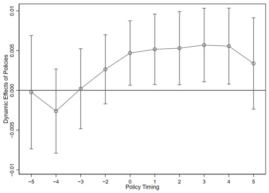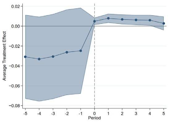 The use of traditional two-way fixed effects model estimators may lead to potential biases [63,64]. First, drawing on the ideas of De Chaisemartin [65], we evaluate the potential biases that might exist. The results of the weight decomposition show that among all 8199 2 × 2 DID weights, 6234 are positive and 1965 are negative, with negative weights accounting for 23.97%. This indicates some bias in the results. Consequently, we refer to the research of Borusyak et al. [66] and employ the imputation method to plot a multi-period DID estimation of the dynamic treatment effect, as presented in Figure 4. Before the policy implementation, the coefficient of Policy fluctuates around zero and is not significant. After the policy implementation, the coefficient becomes significantly positive. The results suggest that after accounting for the estimation biases induced by heterogeneous treatment effects, the coefficient remains significant, confirming the robustness of this paper’s conclusion.
