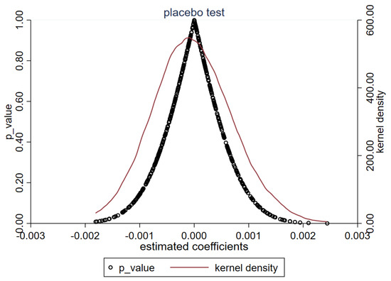 This paper employs the placebo test to confirm the causal relationship between the “Decentralization, Management and Service” reform and corporate innovation efficiency, demonstrating that the increase in corporate innovation efficiency is not due to chance factors [62]. Specifically, we randomly sample the regions and timing for the pilot policy. By using the constructed fictional pilot data, we estimate the benchmark model and obtain a fictional estimation coefficient. This process is repeated 500 times. As shown in Figure 3, the regression coefficients for the fictional events are centered around zero, approximately following a normal distribution, and are much smaller than the regression coefficient (0.0041) for the actual pilot reform. Additionally, most of the p-values exceed 0.10. This result rules out the influence of other chance factors on changes in corporate innovation efficiency, thus validating the robustness of the conclusion.