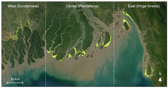 The southwestern coast of Bangladesh is home to 60% of the Sundarbans, the world’s largest continuous mangrove forest. The Sundarbans forest hosts approximately 27 species of mangroves [13], with Heritiera fomes (Sundri), Excoecaria agallocha (Gewa), and Ceriops decandra (Goran) constituting 95% of the forest’s vegetation [13,14]. Despite its designation as a protected natural reserve [14], the Sundarbans have experienced a yearly shrinkage of 0.08% from 1996 to 2016 [15], primarily due to over-exploitation, deforestation, pollution, and natural disasters [16,17].