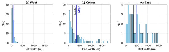 Figure 2. Histograms of mangrove forest belt width for the (a) west, (b) center and (c) east regions. The x-axis represents forest (cross-shore) width in meters, grouped in increments of 50 m, while the y-axis indicates the number of observations in each bin. Blue vertical lines mark the mean forest length, and black vertical lines indicate the median forest width for each region. The histograms highlight the distribution and central tendencies of forest width across the three regions.