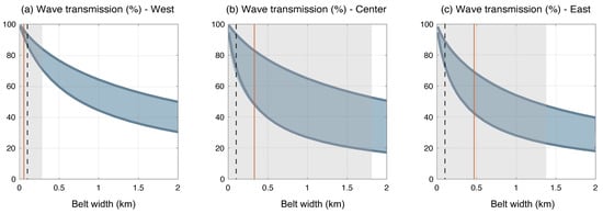 Figure 3. Wave transmission through mangrove belts (%) at (a) west, (b) center, and (c) east of Bangladesh. Blue areas show the range of wave reduction estimates for each belt width, based on the minimum and maximum values of Table 1. Gray areas show the available belt widths in the region, the black dashed line marks a belt width of 100 m, and the orange line indicates the average belt width.