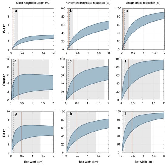 Figure 4. Effect of mangrove afforestation in the west, center, and east of Bangladesh, in terms of (a,d,g) crest height reduction, (b,e,h) reduction in the revetment thickness, (c,f,i) and reduction in the shear stresses. Blue areas show the range of wave reduction estimates for each belt width, based on the minimum and maximum values of Table 1. Gray areas show the available belt widths in the region, the black dashed line marks a belt width of 100 m and the orange line indicates the average belt width.