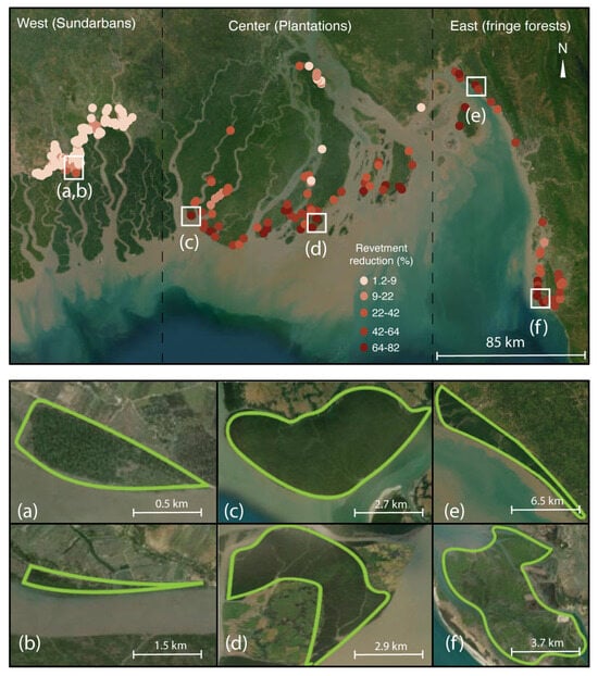 Figure 5. Potential revetment reduction in Bangladesh (%), corresponding with the upper values of wide mangrove belts that could reduce embankment design requirements in Bangladesh in Figure 4, with close-ups of the mangrove belts of (a) Shamnagar (polder 7/1), (b) Shymnagar (polder 15), (c) Amtali (polder 45), (d) Kukri-Mukri, (e) Mirersarai (polder 61/2), (f) Boro Moheshkhali (polder 69). Basemaps by Google Earth (2024).