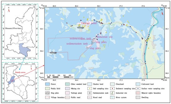The Qinling Mountains are a natural dividing line between the north and south of China and serve as a vital strategic barrier in China in regard to a multitude of geographical features, including climate, water conservation, soil composition, and biodiversity preservation [16,17]. The Qinling Mountains predominantly comprise rocky mid-elevation mountains, characterized by shallow soil layers and steep gradients, making the ecological environment particularly vulnerable. According to the catalog of tailing ponds in the Qinling region released by the Shaanxi Provincial Development and Reform Commission, there are a total of 285 such facilities within the Shaanxi section of the Qinling Mountains, most of which are attached to open-pit operations. These tailing ponds lead to the substantial occupation and degradation of land, water resources, and the surrounding ecological environment in general. Historical metal mining activities may have caused heavy metal accumulation in the surrounding farmland soil; in particular, under heavy rainfall or extreme weather event conditions, these pollutants are more readily dispersed to surrounding areas, thereby posing a potential risk to both human and environmental health [18]. However, existing studies have generally focused on the ecological risk assessment of large-scale agricultural planting areas or urban soil and have paid relatively little attention to the heavy metal pollution in the soil around mining areas. This is especially true regarding the research on the heavy metal in the soil surrounding metal mines in the Qinling Mountains. Thus, a comprehensive pollution assessment of mining areas in the Qinling Mountains is urgently needed.