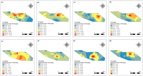 Spatial distribution maps of (a) Cr, (b) Ni, (c) Cu, (d) Zn, (e) As, (f) Pb, (g) Hg, and (h) Cd in the study area.