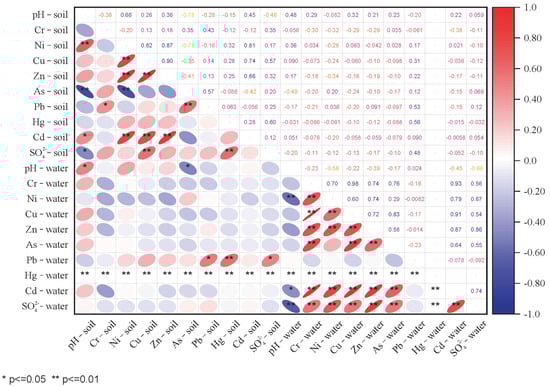 In soil samples, Ni, Cu, Zn, and Cd all demonstrate significant positive correlations at the 0.01 level. Additionally, Pb shows significant correlations with Cr and As; Hg-SO42− also exhibits notable correlations; and pH is significantly correlated with Ni and Cd while being negatively correlated with SO42−, which is consistent with findings for surface water. Notably, there exists a significant correlation between the pH of surface water and that of soil; in particular, lower pH levels in soil correlate significantly with lower pH levels in surface water. Moreover, Pb, Hg, and SO42− concentrations show strong associations across both mediums. This indicates that acidic wastewater generated by mining activities has not only contaminated surrounding agricultural land but has also adversely affected both the surface water and soil within this study area.