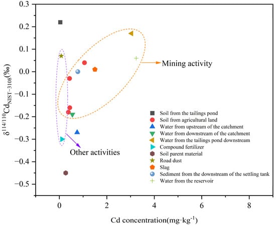 High-temperature emissions of Cd from industrial production activities exhibit distinct isotopic fractionation characteristics when compared to natural sources [26,27], thereby enabling the identification of Cd pollution sources in the environment [28]. Martinková et al. conducted a comprehensive study on the cadmium isotope composition of various industrial raw materials and products, including coal combustion, metal smelting, and refining processes. They found that the cadmium isotope ratios for raw materials, such as sphalerite, galena, coal, and pigments, were measured at 0.02–0.1‰, 0.13‰, −0.23‰, and −0.01‰, respectively [1]. Furthermore, the cadmium isotope signatures of the slag and dust generated by smelters ranged from 0.15‰ to 0.51‰; those of coal-fired power plant waste varied between −0.32‰ and 0.44‰; and those of glass manufacturing waste exhibited values of 5.86‰ and −0.86‰, with an additional range of −3.0‰ to 2.1‰ [29,30,31]. Additionally, agricultural soils are influenced by anthropogenic sources such as fertilizers and sludge, which have been shown through various studies to possess isotopic compositions ranging from −0.17‰ to 0.25‰, −0.09‰ to 0.11‰, +0.35‰ to 0.38‰, and −0.07‰ [32,33]. These findings clearly demonstrate that different end members display diverse cadmium isotope ratios, providing a theoretical basis for utilizing isotopes in tracing cadmium emissions derived from both natural origins and human activities.