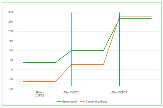 The influence on investor behavior and bond pricing from COP26 and COP27 can be translated through several interconnected mechanisms, such as policy announcements, market expectations, and investor sentiment. Policy announcements at events like COP26 and COP27, including commitments to net-zero emissions and significant climate finance targets (e.g., USD 100 billion annually), enhance the appeal of sustainable finance. These pledges boost demand for green bonds as investors align portfolios with sustainability goals, leading to lower yield spreads and reduced perceived risks compared to conventional bonds. COP events significantly heightened investor awareness of environmental issues, as reflected in the increased interest in terms like “green bonds” during these periods. This heightened attention, combined with ESG mandates, drives investors to prioritize green bonds for their perceived dual benefits of financial returns and alignment with sustainability goals. In addition, COP events emphasize stricter regulations for carbon-intensive industries, increasing perceived risks for conventional bonds while making green bonds more attractive due to lower regulatory and reputational risks. These events may also trigger short-term market volatility, prompting investors to diversify into green bonds as a hedge against long-term environmental and policy risks.