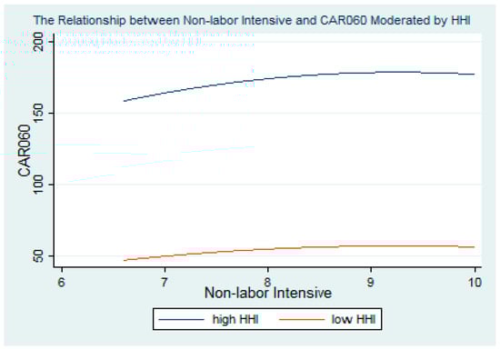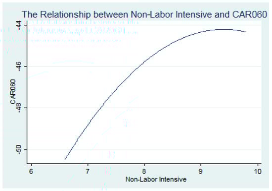 The statistical results allowed us to comprehend their intrinsic nature through visualized graphs. Specifically, according to Table 2, Model 3 reveals a significant positive relationship with a statistically significant value (p < 0.05) between the non-labor-intensive variable and the independent variable CAR060. This supports H1, there is a positive relationship between non-labor intensity and firms’ performance. Therefore, Figure 3 implies that a non-labor-intensive firm is likely to perform better.