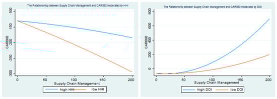 We also propose that the relationship between supply chain management and a firm’s performance is influenced by two moderators. The first relationship is how the degree of internationalization (DOI) moderates supply chain management and companies’ profitability. Recent studies support the idea that strong links with suppliers and distributors can enhance the competitiveness of the entire supply network, fostering firms’ development and facilitating innovative solutions [,]. Particularly from an international perspective, internationalization poses challenges and requires improved innovation performance []. Giovannetti, Marvasi, and Sanfilippo [] claimed that well-managed supply chains can promote firms’ engagement in cross-border markets, opening new niches and enabling enterprises to overcome obstacles, like information costs, contract incompleteness, and other structural barriers to the internationalization process, ultimately leading to long-term profits. Thus, firms with well-organized supply chain networks are likely to expand their business beyond their borders to enhance their performance.