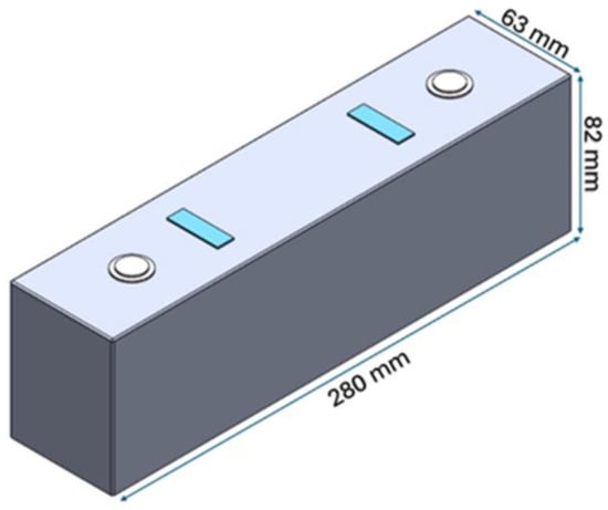 Stock et al. [15] defined that in LFP (lithium iron phosphate) batteries, each individual cell, as shown in Figure 2, has dimensions of 63 × 82 × 280 mm and weighs 3.163 kg. Considering the total number of cells that make up the battery pack, the total weight of battery cells is 328.6 kg [13].